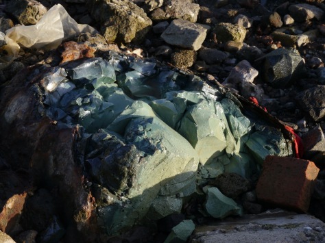Splott beach is an industrial archive. Bricks, tiles, parts of the former East Moors steel works –broken crucibles, substances produced by heat, there are endless objects to be found on the beach. It’s a joy for someone like me who enjoys pottering about and taking photographs. There is so much beauty in degraded industrial objects. Less beautiful are current human interventions; the beach and the coastal path are frequently used as an alternative to the Lamby Way tip.