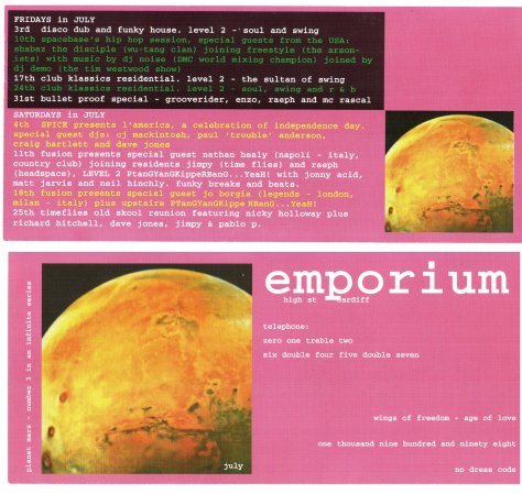 Big thanks to all the geriatric ravers who contributed to this article. In no order, because we like to mix things up: Tim Corrigan, Neil Cocker, Matt Jarvis who provided the flyers, Henry Blunt, James Drop for many fun nights dancing downstairs in Las Iguanas, Rick Latham for all those hours listening to funky house in Catapult, Tyrone Rose, Lucy Thomas, Simon Thomas, Doug Nicholls, Carl Morris, Twm Owen, Lubi J, Dean Thomas, Matthew Miles, Gareth Coates, Craig Bartlett, Tony Davidson, David Tumulty, Jon Rostron, Rhys Thompson, Tony Davidson, Nadia, Lawrence, Stig, Luke, Nat, Gav, Eleri, Pam, Kaptin, plus all those I met on the way, whose names I can’t remember, but who shared warm embraces, warm beers, and a warm dancefloor with me over all those late nights, all that time ago. Also anyone else who talked to me about the Emporium, who I’ve forgotten to mention.