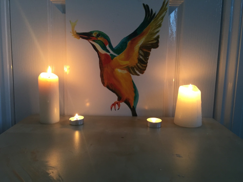 Now, I’m not exactly in a “cell” in a two bed house in Canton, and I’m not exactly living like a monk (I do have Netflix) but I’m trying to be inspired by Julian in my life right now. I’m trying to live simply, quietly, to be still enough to pay attention to my soul. And so I chant, I meditate, I pray. I have a small altar table in my room with candles and a picture of a kingfisher painted by a friend of mine (the kingfisher has always been a symbol of the divine for me). Every Wednesday I share Celtic morning and night prayer on my page, Riverside Ministry Project Facebook page.