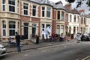 As well as my first socially distanced protests, the lockdown has given me a couple of other ‘firsts’. I’ve always been grateful for where I live – a quiet but friendly street down the Docks (I am chastised constantly by people who’ve grown up here when I call it Butetown or Cardiff Bay). During lockdown we have our first socially distanced street parties, where I learn the electric slide. A swan gets stuck on our road on one very hot day, and me and a group of us usher it down the street and back into the river. Some enterprising neighbours set up a Whatsapp group for our street, and we are now all in an endless dance of lending tools and swapping plants and gifting books and baking cakes for each other. I love it.